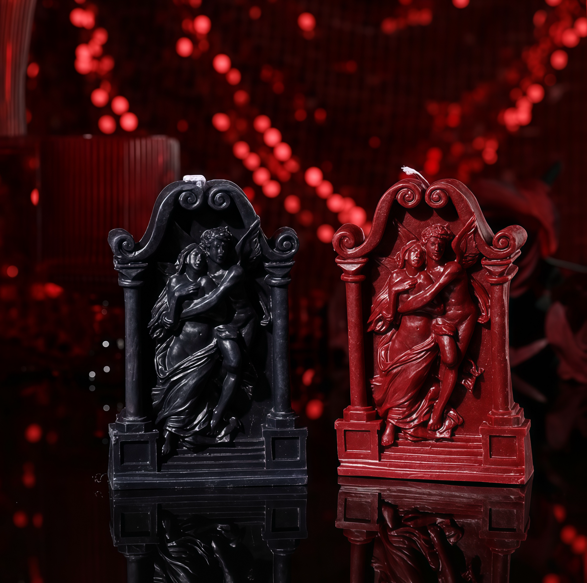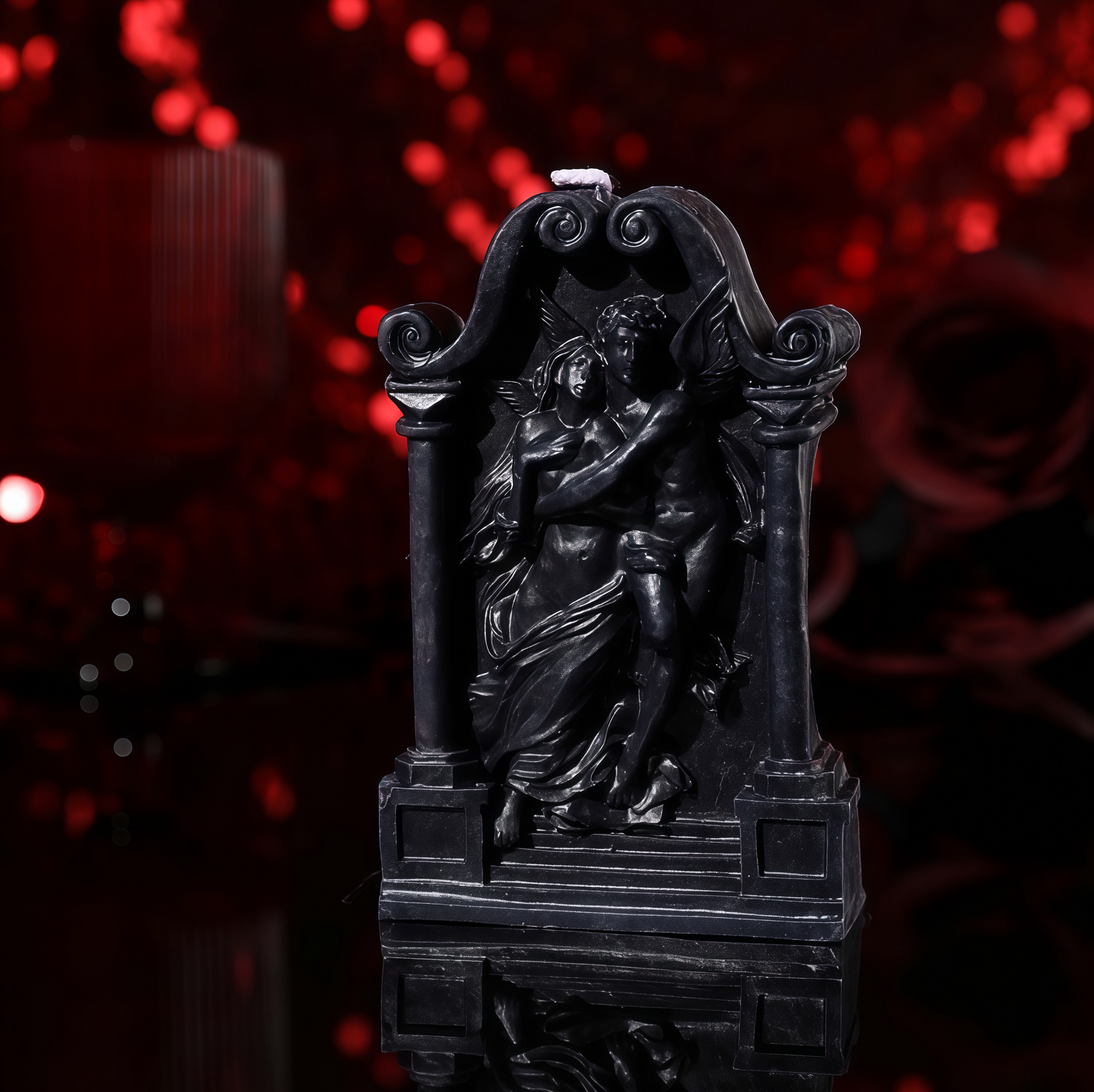 Eterna captures a frozen moment of divine passion—two celestial figures entwined beneath gothic arches, hand-poured into a richly detailed, low-temperature wax sculpture. Ideal for dark romantic settings, luxury gifting, or collectors of baroque decor. Safe to burn, unforgettable to behold.